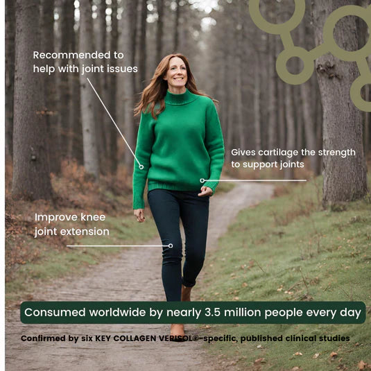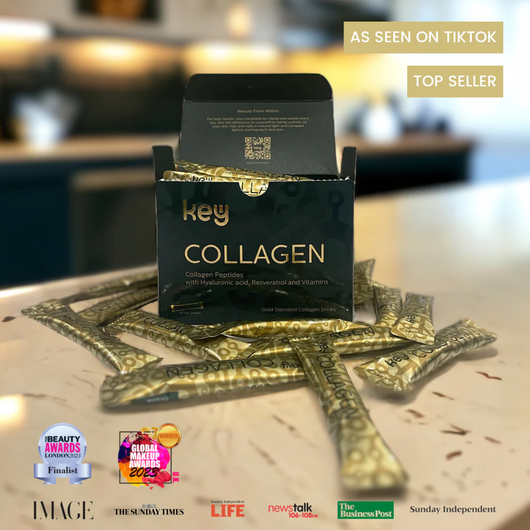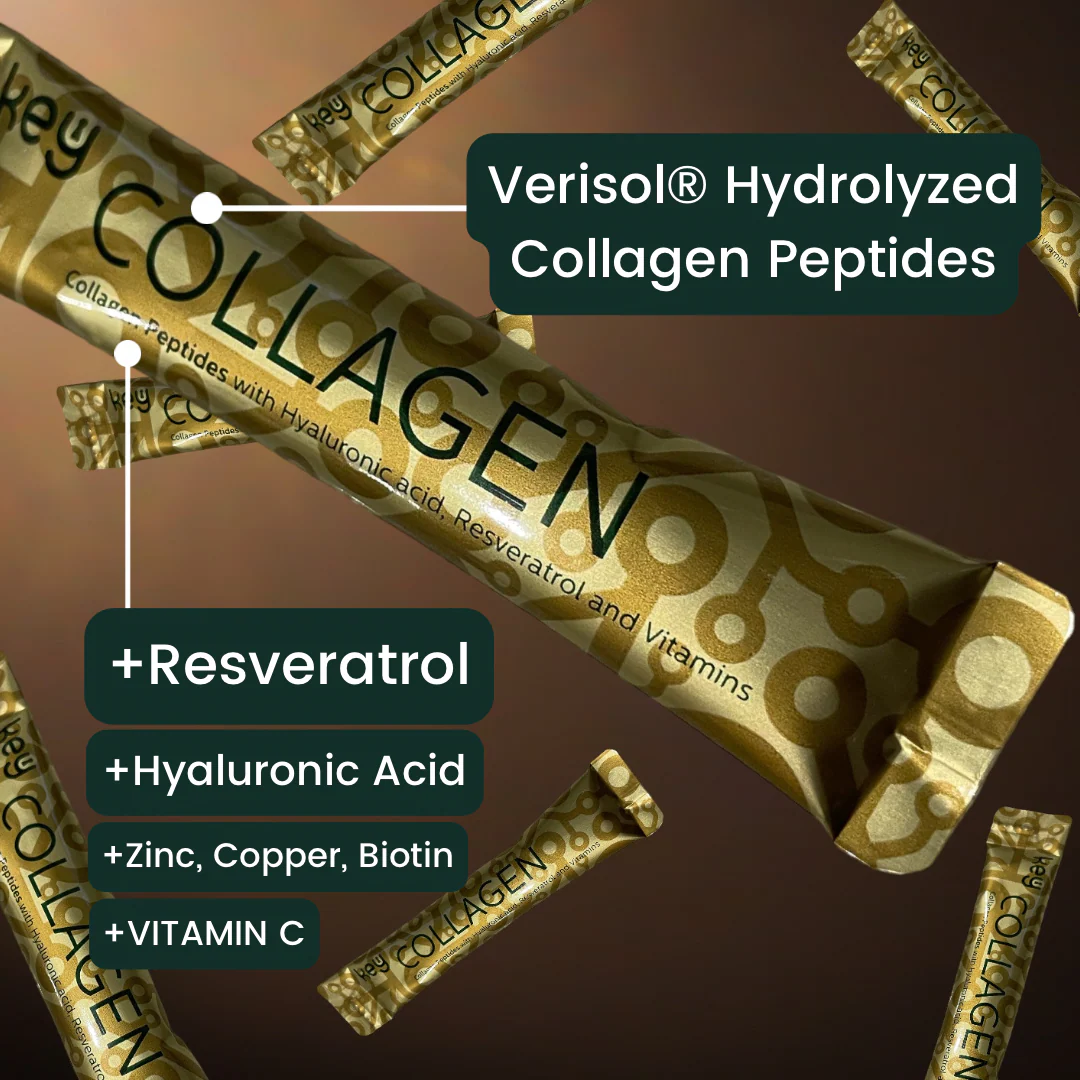 Key Collagen contains 2500mg of AVCENX's hydrolysed collagen peptides along with nutrients like Vitamin C, Biotin, Zinc, and Hyaluronic Acid. These ingredients work together to support the body’s natural collagen processes and help maintain healthy-looking skin, hair, and nails as part of a daily wellness routine.
